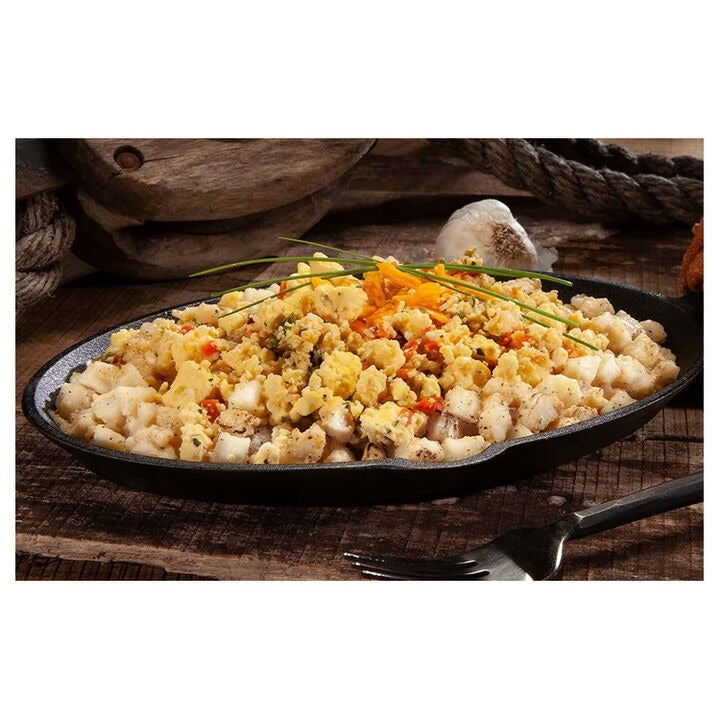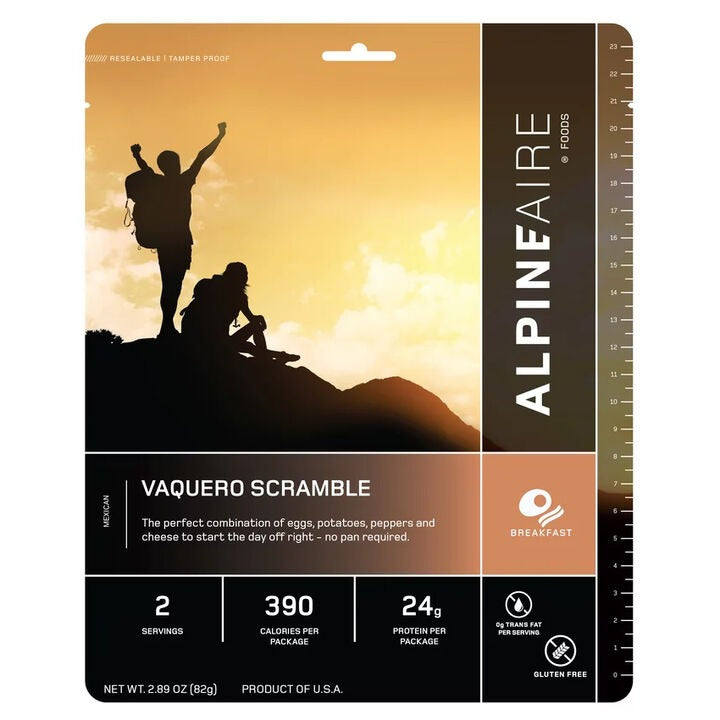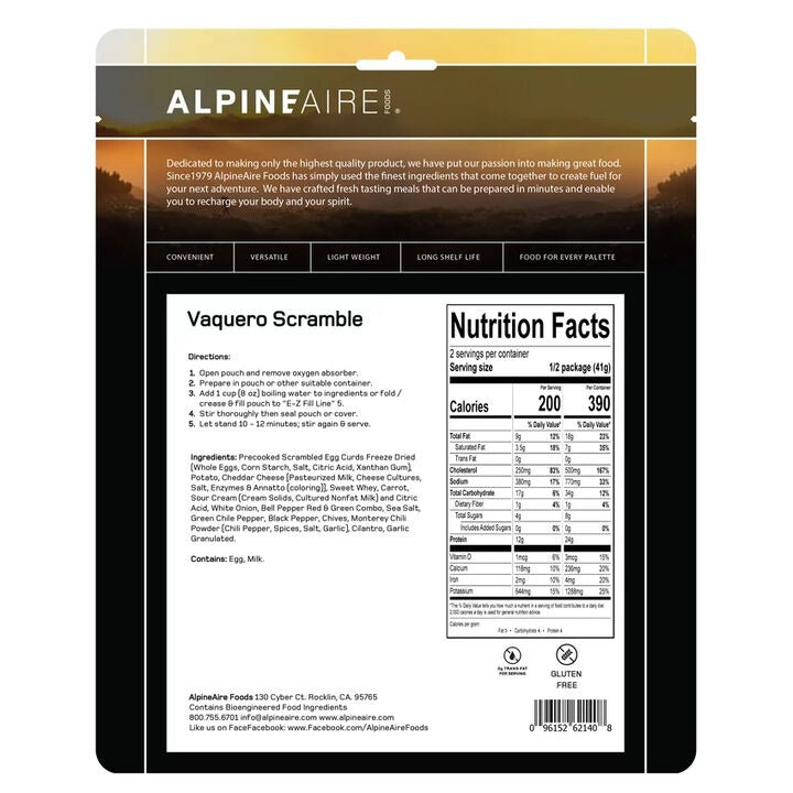 Get your day started right with the AlpineAire Vaquero Scramble, the perfect combination of eggs, potatoes, peppers, and cheese. No pan required, just add boiling water, set aside for several minutes, and enjoy.