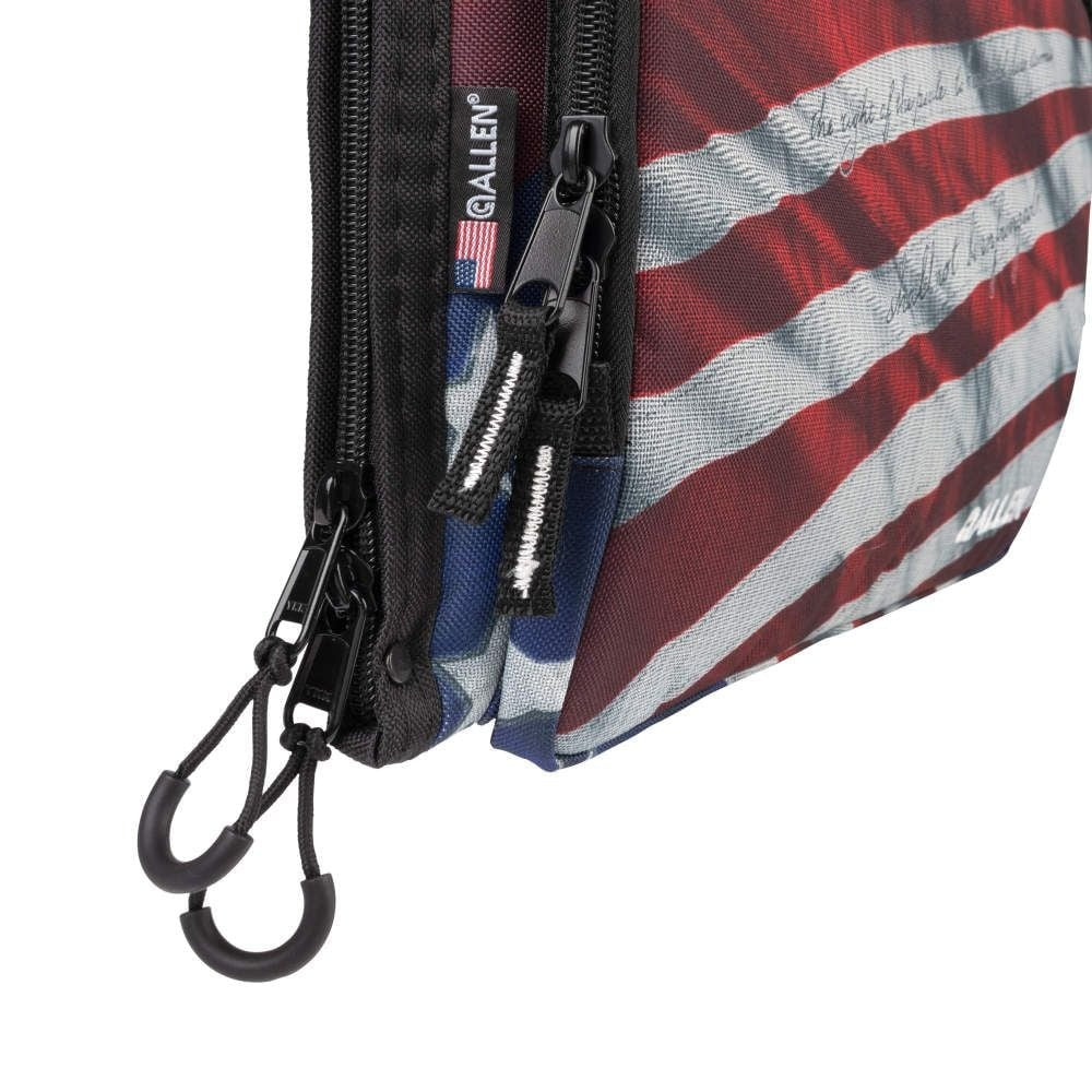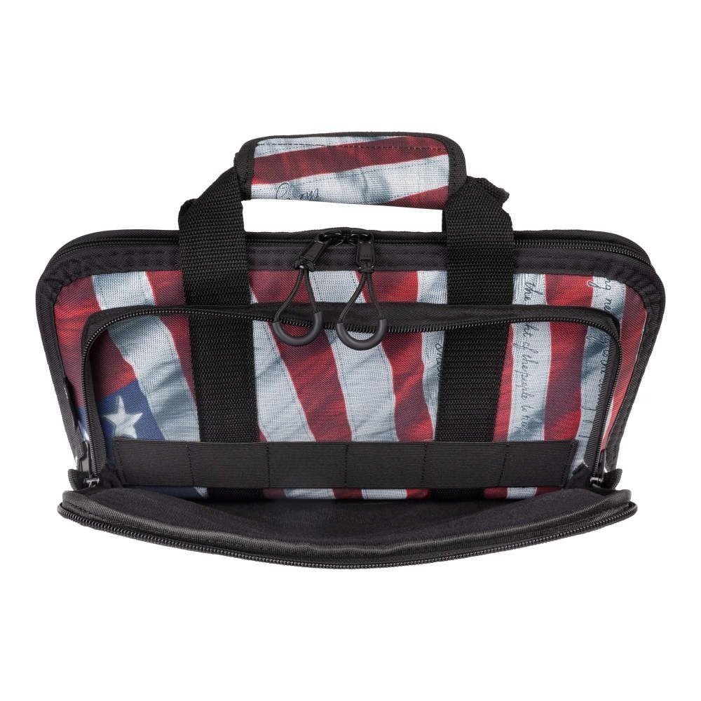 The Victory Duplex Handgun Case is Made in the USA, fits two handguns, and features a stars and stripes pattern that lets you show your American pride. The exterior is made from rugged Endura fabric, and the interior has a soft knit lining. The case also features thick foam padding and internal organization for your magazines, as well as a padded hook and loop carry handle. Lockable.