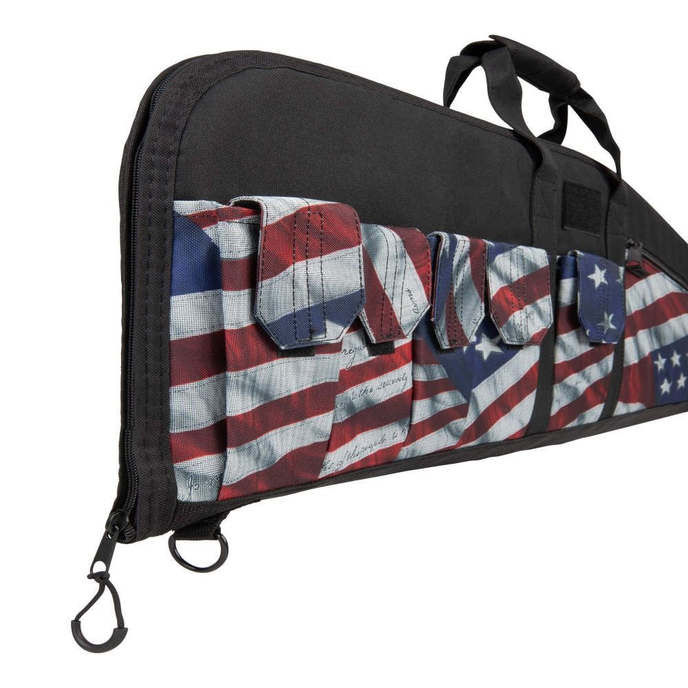 The Victory Tactical Rifle Case is Made in the USA and fits rifles up to 42-inches. Our Tactical rifle case features a stars and stripes pattern to show your American pride. It is equipped with a thick foam padding for maximum protection, multiple external pockets for magazines and gear. It also features a padded hook and loop carry handle. The exterior is made from rugged Endura fabric, and the interior is a soft knit lining. For security, we have made the Tactical rifle case lockable.
