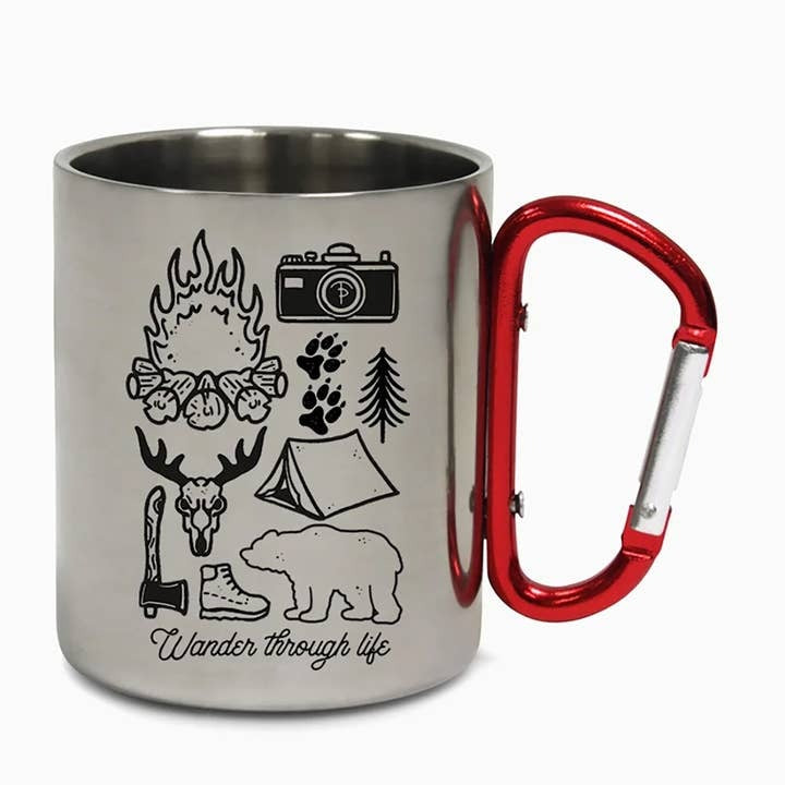 Stainless Steel Mug 300ml w/Red Carabiner Handle. Lightweight, and with the functional carabiner handle this is perfect for outdoors and camping. Handwash only. Comes boxed. Printed with sublimation inks and dispatched from our print shop in Hertfordshire, England.