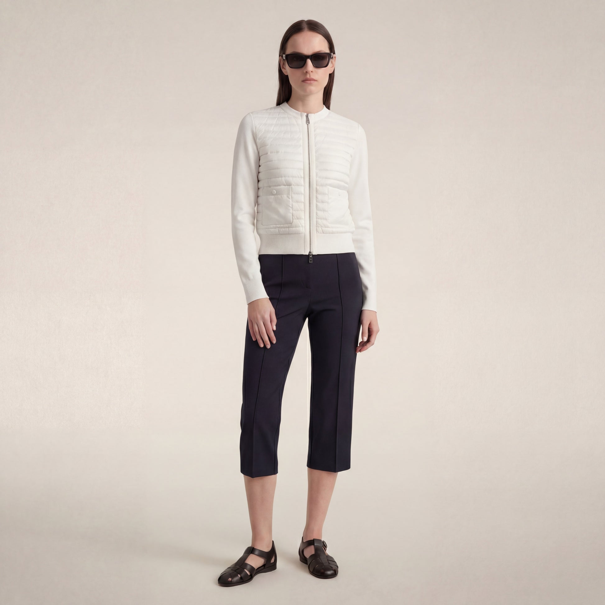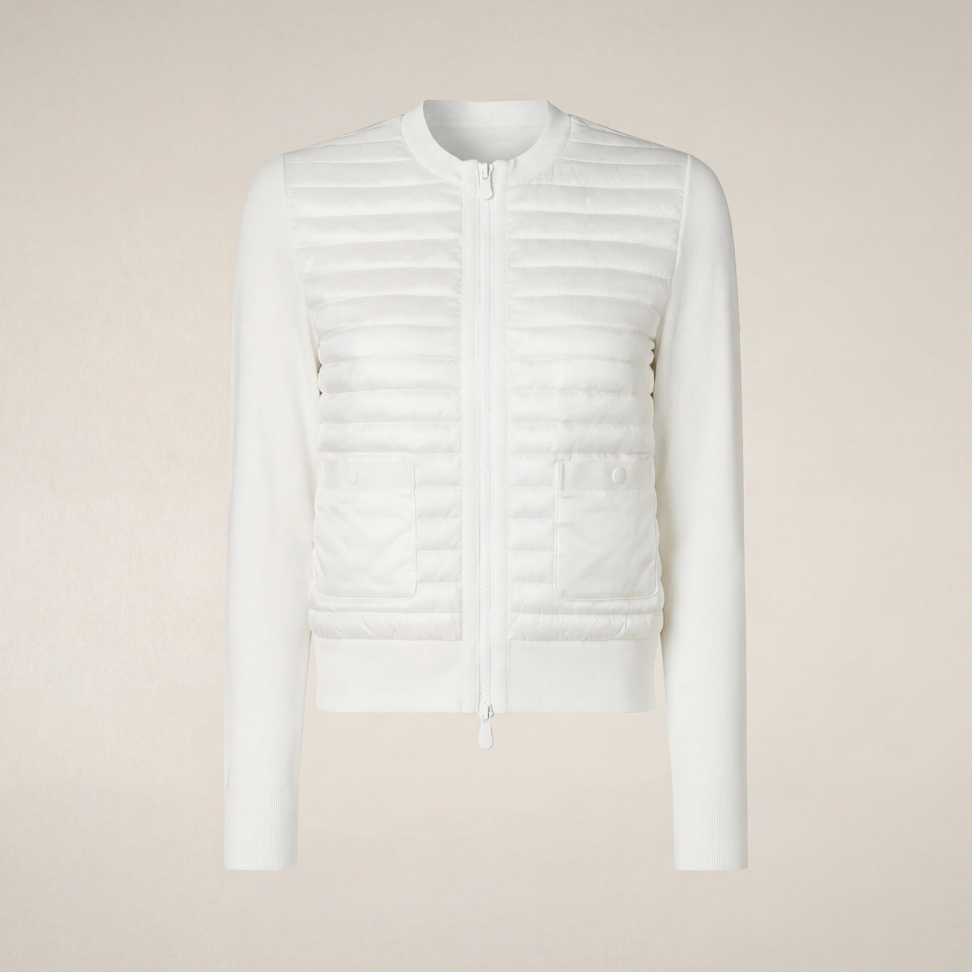The Briony jacket combines a slightly cropped fit with a quilted front and knit sleeves and back, offering an elegant layering option for summer and in-between seasons. With snap-button pockets, a zip closure, and ribbed finishes, it's both stylish and functional. The tonal badge on the sleeve adds a signature accent.