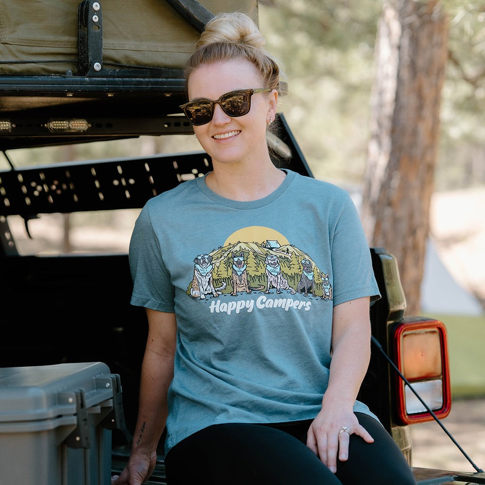 If you're a happy camper when you're outside, this design is for you. If you're happiest in a tent with four-legged fury pals, say no more. Regardless, choose to be a Happy Camper — the world is a better place for it. RELAXED FIT.