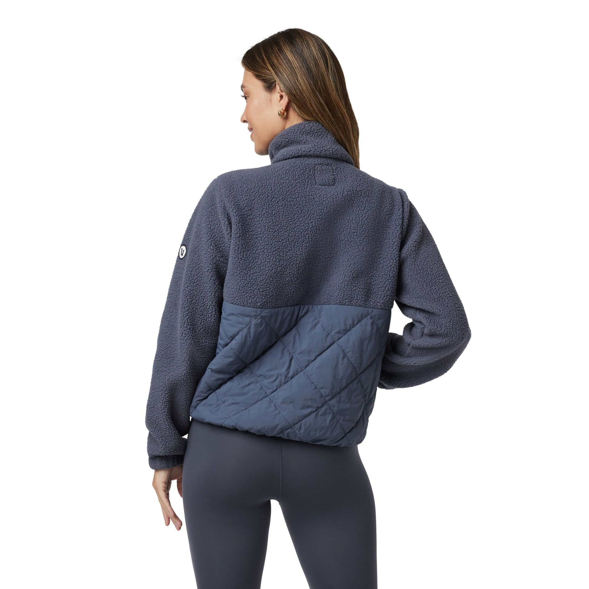 Made from recycled materials, the women's Vuori Highlands Sherpa Fleece jacket has a quilted woven bottom panel and center-front zipper with stormflap for added warmth and wind protection.