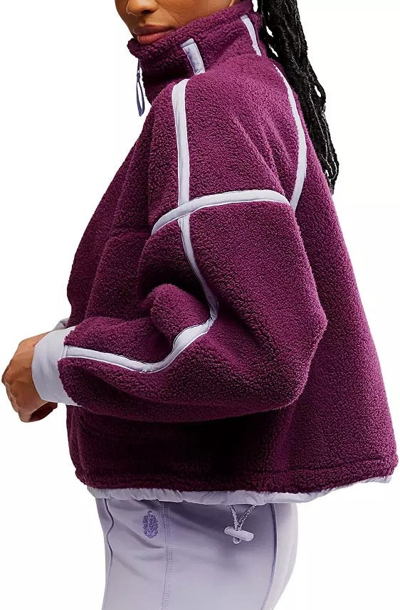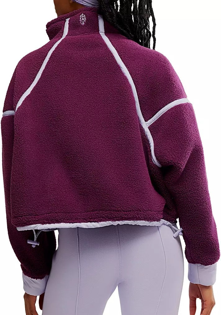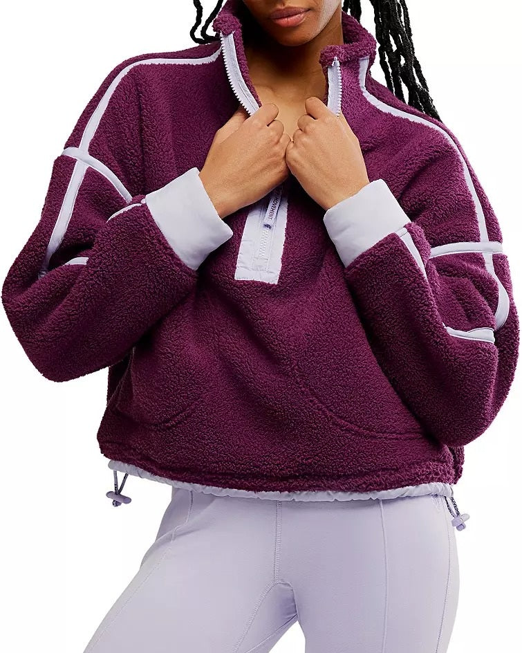Cozy fleece pullover featuring a half-zip closure and high neckline with bold contrast seams throughout and an adjustable hemline.