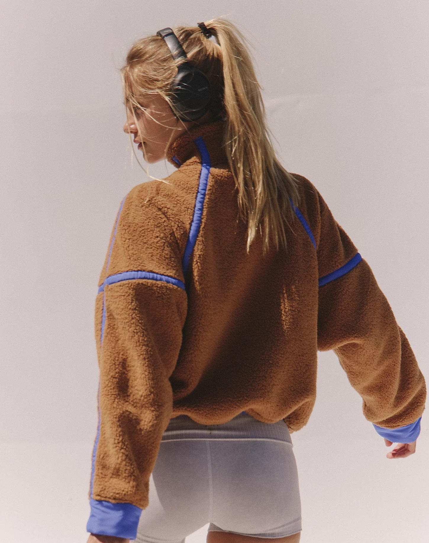 Cozy fleece pullover featuring a half-zip closure and high neckline with bold contrast seams throughout and an adjustable hemline.