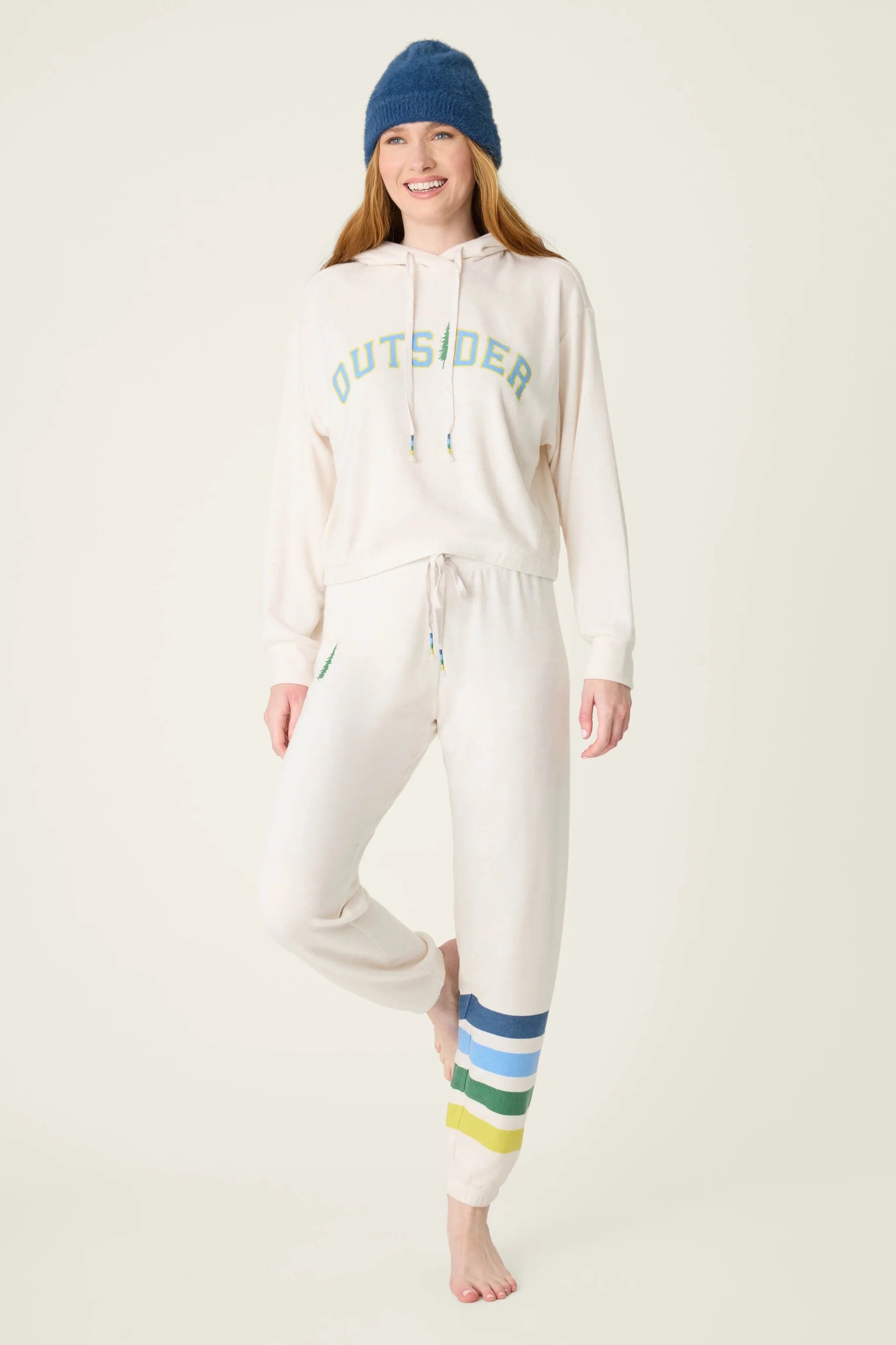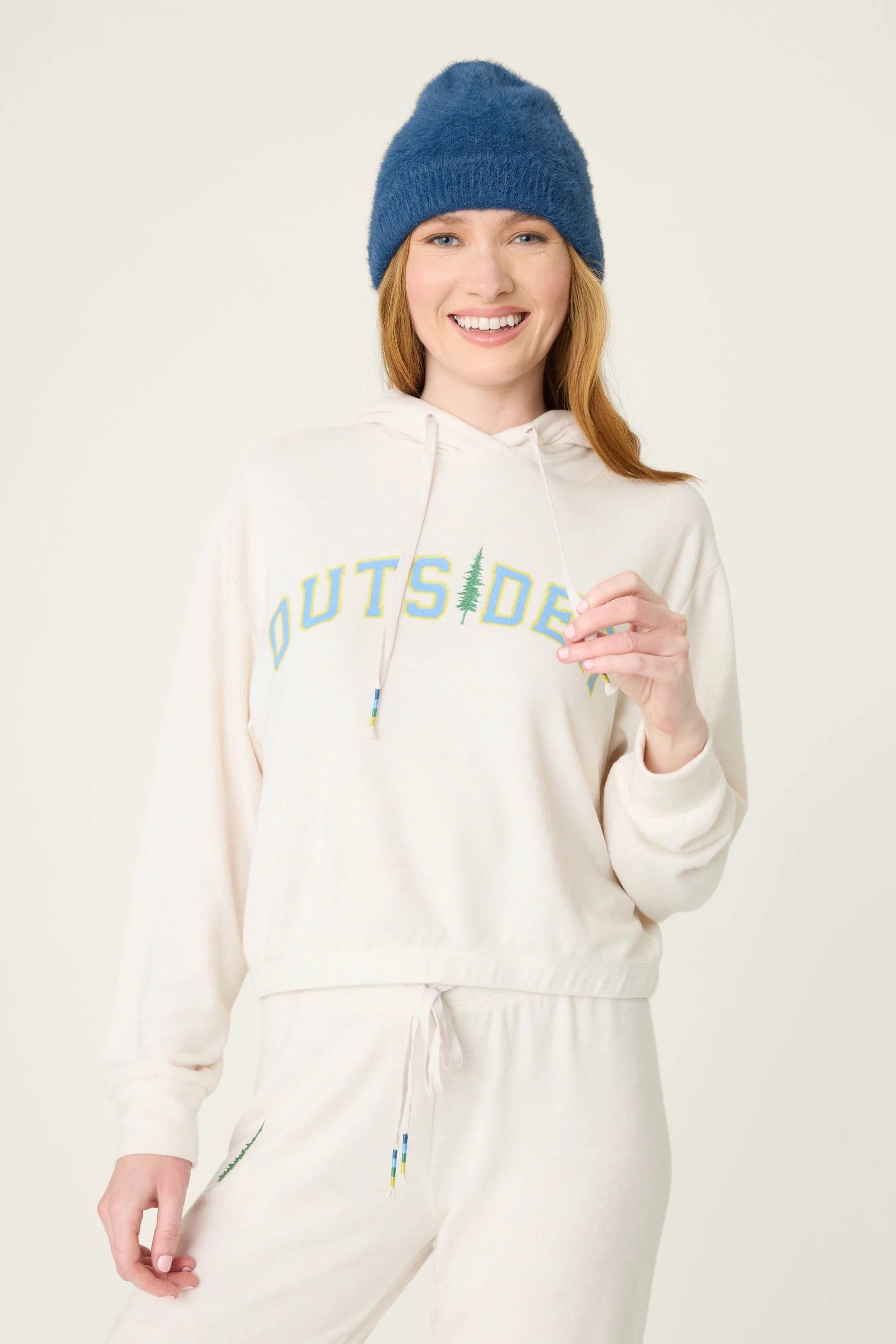 For nights that call for hibernation mode. This hoodie features a bold “Outsider” graphic and a drawstring hood finished with colorful beaded ties. Crafted in soft peachy jersey, it’s made for winter lounging—whether you’re fireside at home or channeling the outdoorsy spirit from the couch.