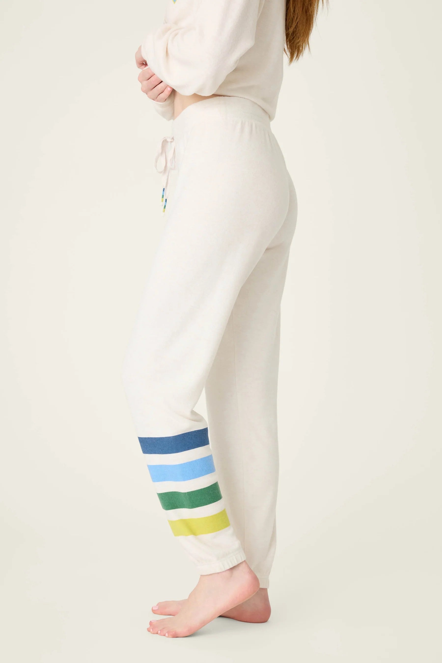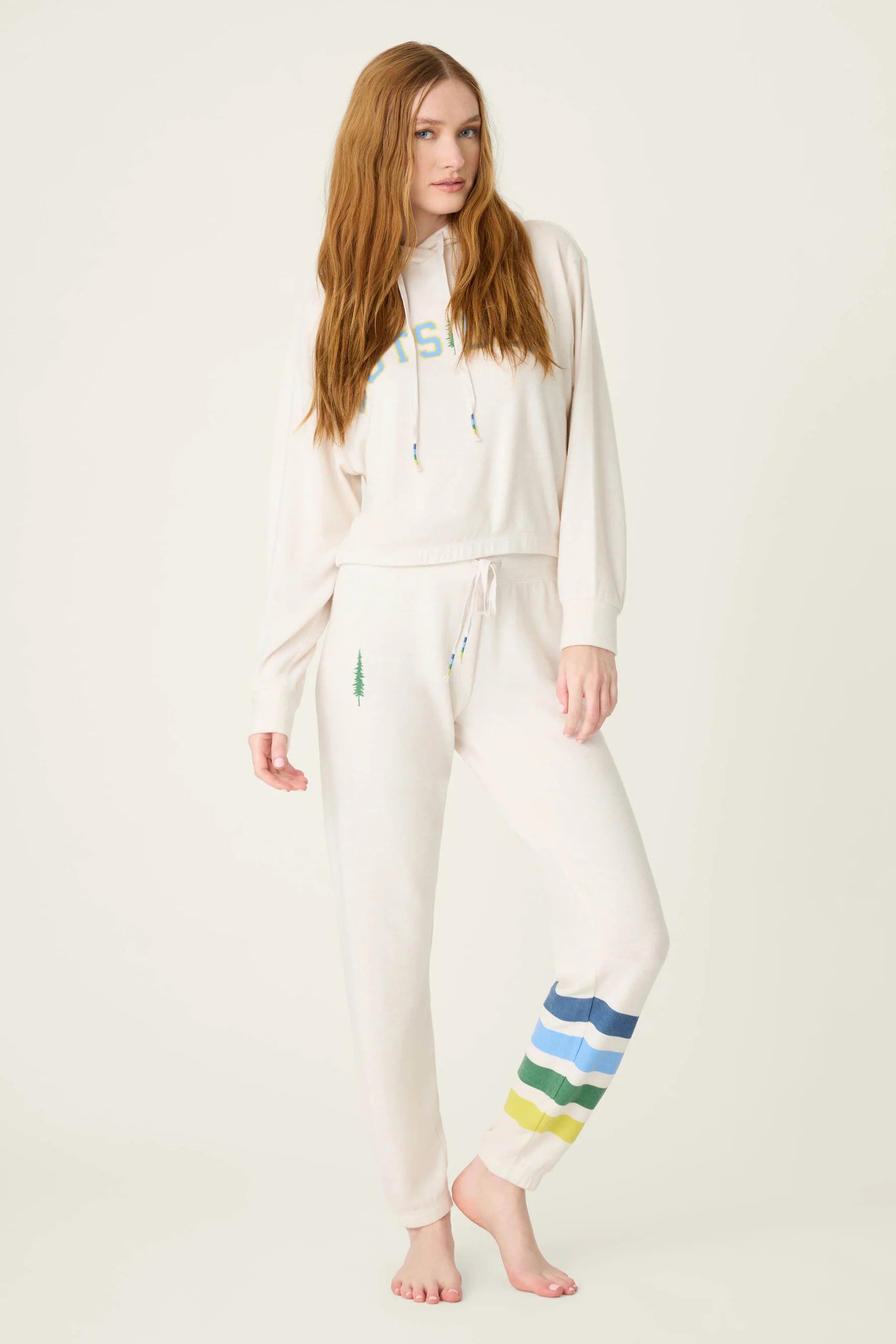 That feeling of crisp winter air, while staying cozy in these so-plush joggers. Finished with colorful ankle stripes and a tiny tree accent, they’re made in ultra-soft peachy jersey—your go-to for winter lounging with a playful outdoorsy touch.