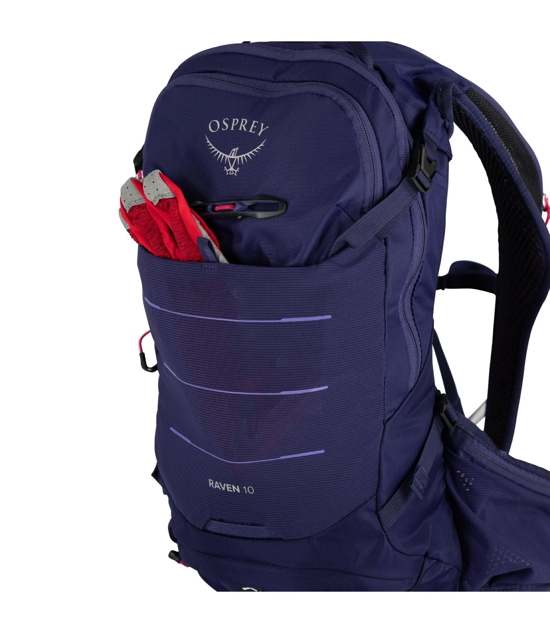 Ride all day with this spacious, premium mountain bike hydration pack and included 2.5-liter reservoir. Hipbelt pockets on the women's-specific Raven 10 grant in-motion access to snacks or phone while a winged shoulder harness and airmesh wrap hipbelt keep your ride stable and secure. Bike-specific features like a tool roll and sunglasses pocket will delight even the most serious riders.