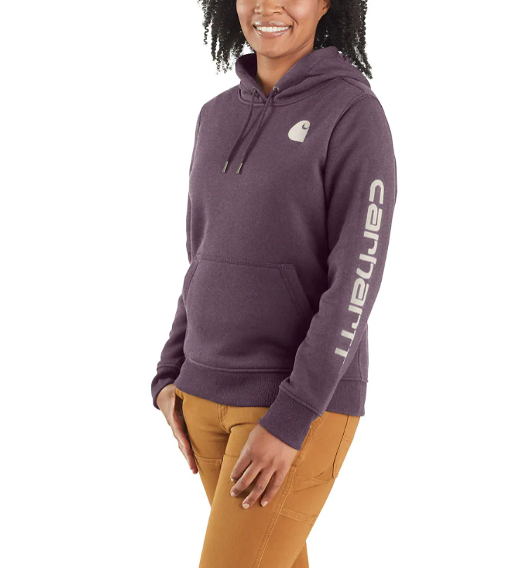 Cold winter mornings are a lot more comfortable with this women's cozy hoodie. Made of heavyweight fleece, the sweatshirt is brushed on the inside for extra softness. It has a relaxed fit that allows for easy layering, and it's finished with a Carhartt logo down the sleeve.