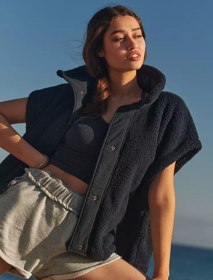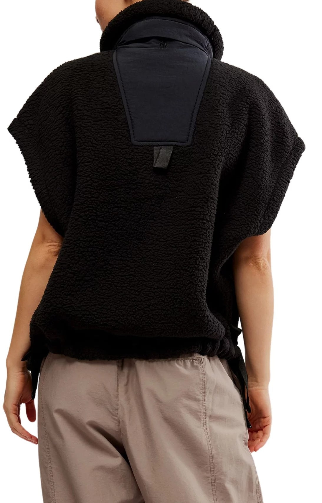 Features: Warm fleece fabrication; contrast nylon paneling; boxy short sleeves; rubber coated snap-front placket; high, funnel neck; jersey lined hand pockets; adjustable knit tape drawcord at hem; locker loop and embroidered buti logo at back.