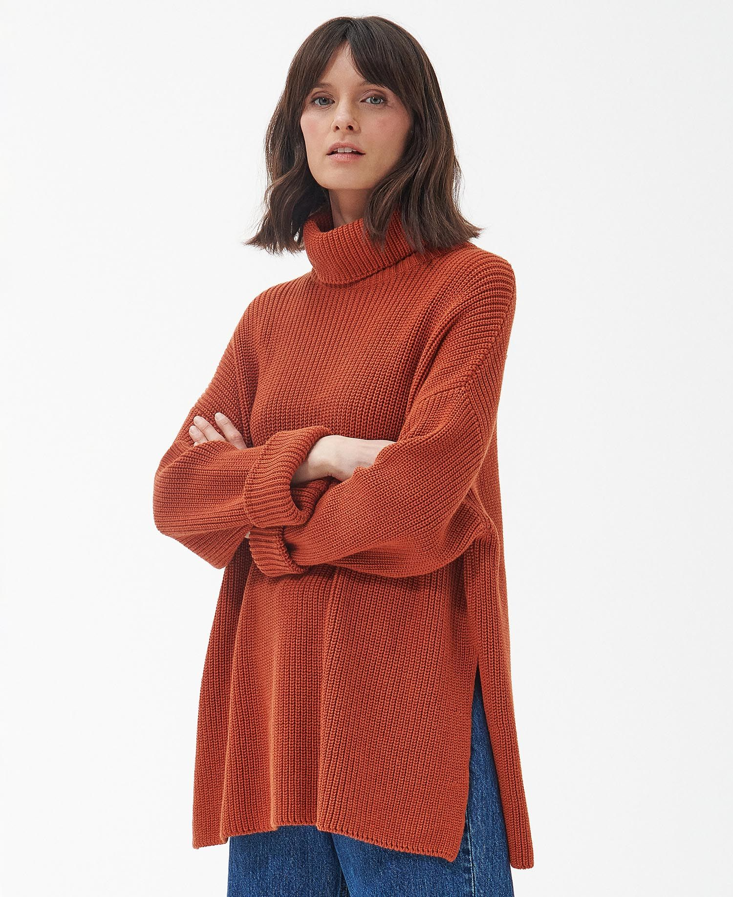 Offered in a soft cotton-wool blend this rollneck cape boasts a ribbed pattern throughout for a subtly textured look. With open side seams and turnback cuffs for an easy fit, the sweater is finished a metal logo bar to the back neck.