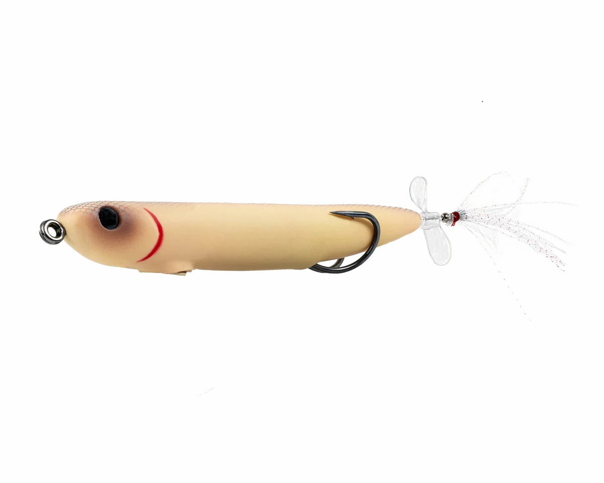 The Snag Proof Zoo Prop Topwater Lure joins the Snag Proof Zoo series as a surface-churning powerhouse. This longer, soft hollow-bodied topwater lure features a precision-engineered prop tail that sputters and stirs up serious commotion with every move. Built with a weedless hook design, it slides through cover while delivering lifelike action and explosive surface strikes. It's a topwater essential for anglers who want maximum impact with every cast. The hydrodynamic design allows for smooth & natural gliding movement across the water with minimal effort. The clear, cupped prop is designed to grab more water and spin at slow speeds, generating an irresistible noise and bubble trail that entices fish. It is precision balanced to enhance the desired body rolling action that produces a color flash effect that entices fish. The tail feather adds subtle movement and flash, imitating the appearance of struggling baitfish.